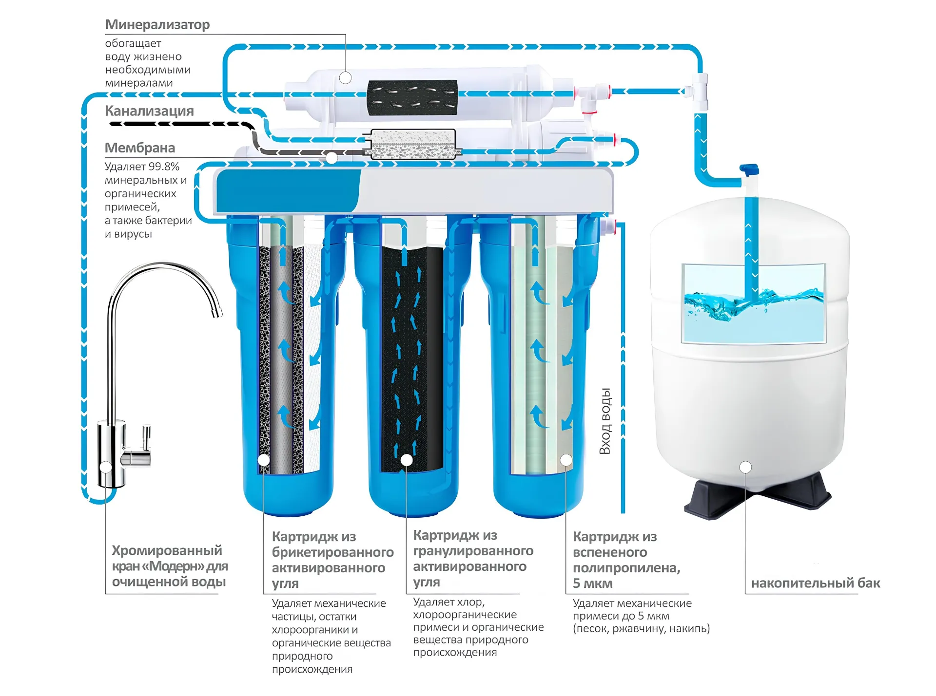 Система обратного осмоса эффективно очищает воду от всех видов загрязнений, органических и неорганических соединений, устраняя неприятные привкусы и запахи. Обеспечивает постоянный доступ к чистой воде для питья и приготовления пищи, что благотворно влияет на здоровье.